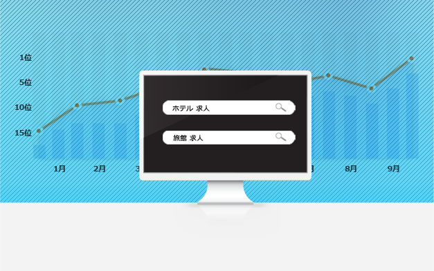 「ホテル求人」「旅館求人」の検索上位表示を実現するため、私たちは徹底的なニーズ調査と分析を行い、SEO対策に注力しています。