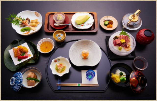 【お食事】季節の懐石料理で新鮮な魚介類と旬の野菜や珍味などを贅沢に使った献立です。