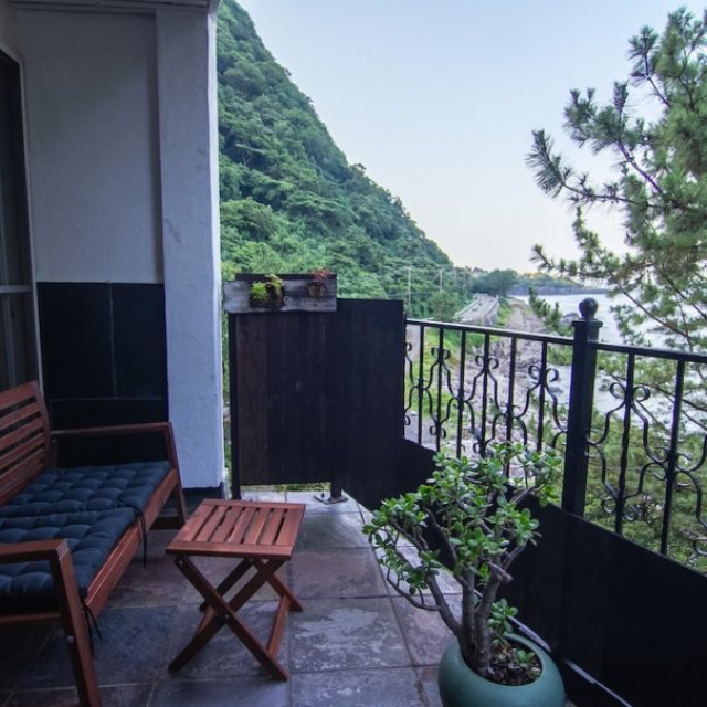 全ての客室にはテラス、オーシャンビューの天然露天風呂が付いています。海辺までは徒歩3分です。