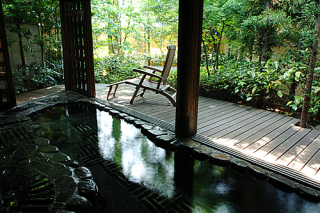当宿には日本庭園を臨む男女別大浴場をはじめ、貸切露天風呂と陶器風呂を完備。