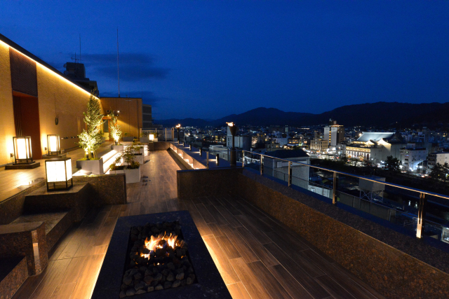 第二のリビングと言えるルーフトップ「空庭テラス」からは、東山から登る朝陽を堪能することができ、足湯ラウンジでほっこりゆったりと京都の大パノラマ景色を存分に楽しむことができます。