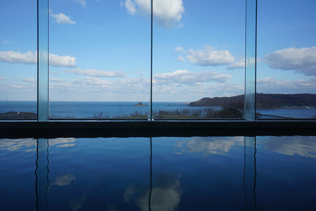 【温泉】空色に染まる大浴場。やわらかな男鹿半島⼾賀温泉の湯浴みを心ゆくまで堪能。