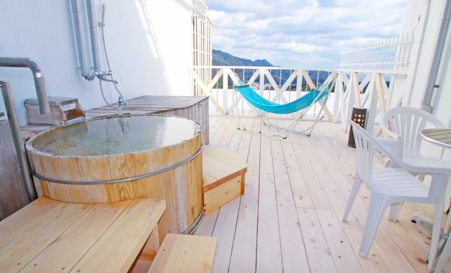 敷地内から湧き出る温泉を使用し、山々と太平洋を見下ろす眺望が自慢の客室です。