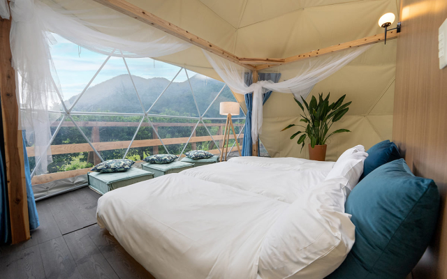神奈川県足柄上郡、丹沢湖を中心とした丹沢大山国定公園の自然郷の中に位置する「スプリングヴィレッジ 足柄・丹沢温泉リゾート&グランピング」は、全棟に半露天風呂を配置した、癒しのプライベート空間を確保したグランピングリゾート。