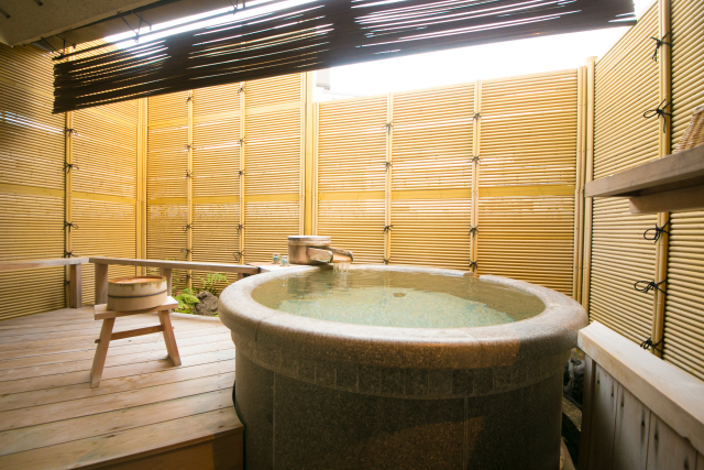 人気の露天風呂付客室は全8室。いろいろな形のお風呂があります。源泉100%。