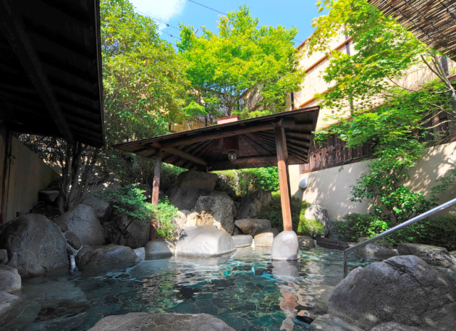庭園大露天風呂・星月の湯は緑に囲まれた癒しの空間。夜は美しい星空が格別です。