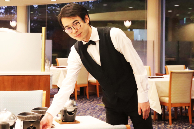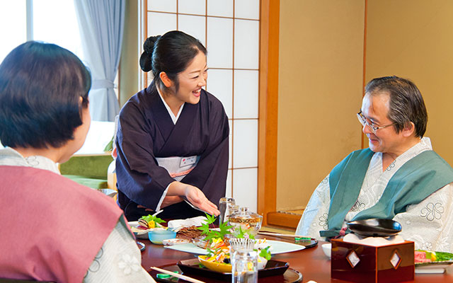 部屋・宴会場での和会席(着物・作務衣)、レストランでの和会席、炭火焼会席、ブッフェスタイルにておもてなしを行うため、お客様に日本文化を感じていただけるお仕事です。