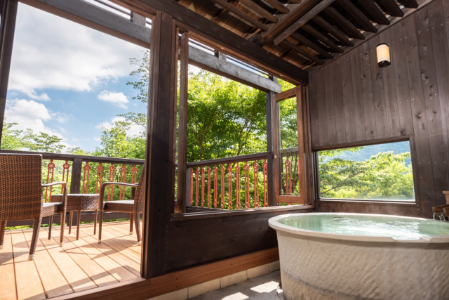 全13室。すべての客室に備えた露天風呂は大涌谷温泉かけ流し