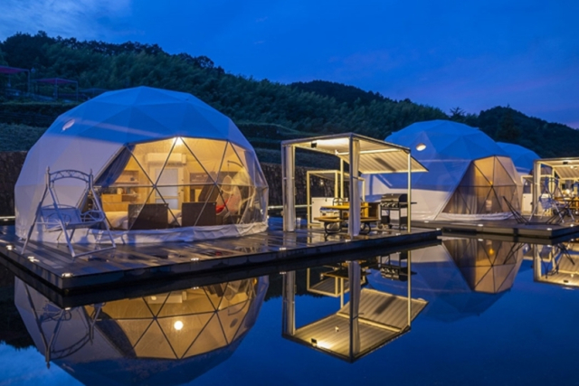 日本初の水盤上に浮かぶラグジュアリードームテント。 幻想的なグランピングをお楽しみいただけます。