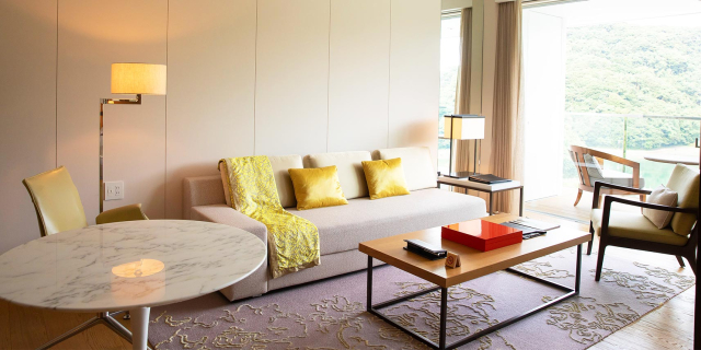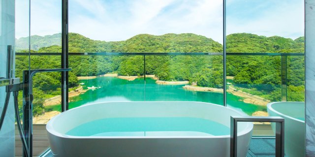 全ての客室が全面ガラスのベイビュー。紺碧の海と緑濃い森のコントラストを眺めることができます。