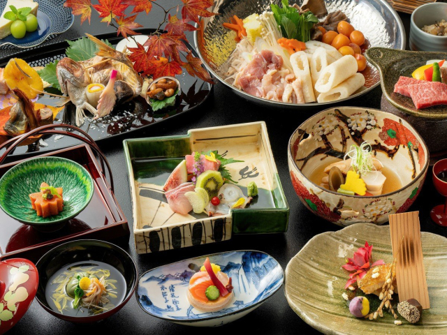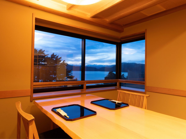 【花心亭しらはま】ダイニングルームで、その時期の旬の食材を使用したお食事を提供しています。