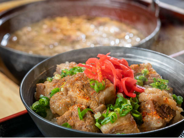 滝の湯名物「牛すじ丼」。多彩な食材をビュッフェスタイルで提供します。