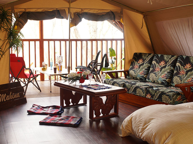 キャビンテントの中は、ハワイアンをイメージした快適な室内です。