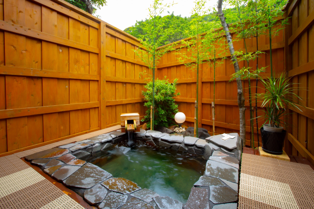 24時間入れる2つの貸切露天風呂もあり、家族やカップルに人気の宿です。