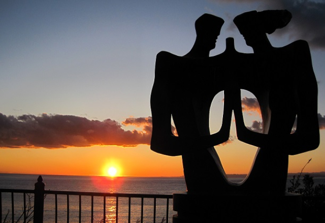 海と空を紅く染めながら、水平線に沈む夕陽。自分も笑顔になるとても魅力的なお仕事です。