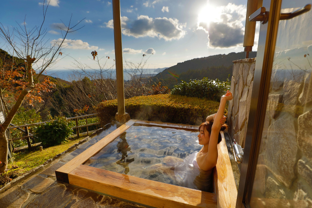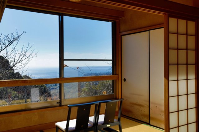 山道に面していて、森のさざめきと鳥の鳴き声だけが聞こえる空間に佇む小さなお宿です。窓からは太平洋が一望でき、全室客室露天風呂付きの完全に隔離された世界。各予約サイトでもお客様より高評価をいただいております。