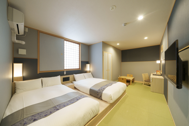 畳の上にベッドがある和モダンなお部屋は海外のお客様にも好評です