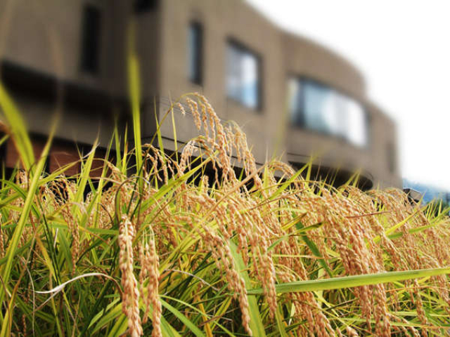 創業時より敷地内に田んぼを作り、スタッフ一同で田植えをし稲を育てています。
