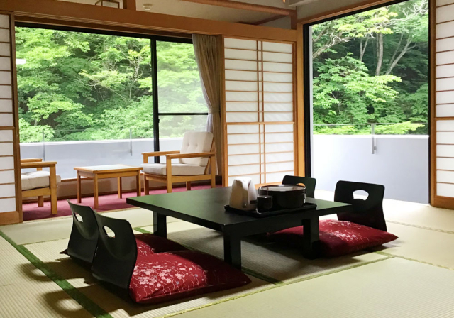 蔵の客室。全室、鬼怒川の渓谷を窓から見ることができます。