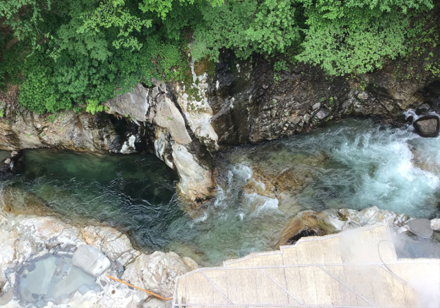 手前が当館の露天風呂。蔵には露天風呂が合計6つあり、全てすぐ横に鬼怒川が流れていて魚釣りもできます。
