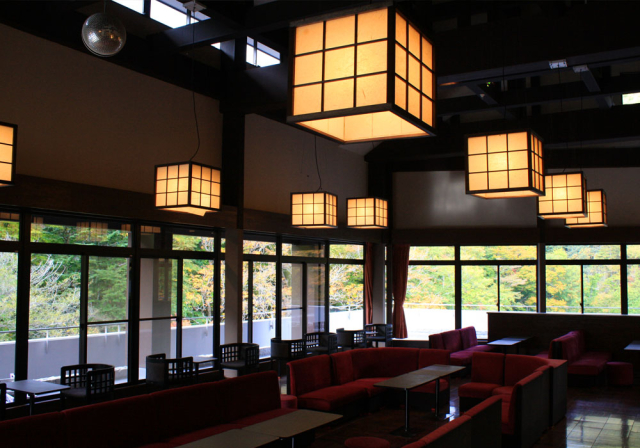 蔵の7階のラウンジ。7階からでも、窓から鬼怒川の渓谷の樹々を見ることができます。