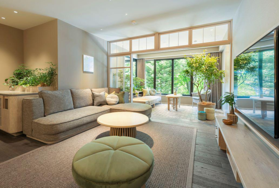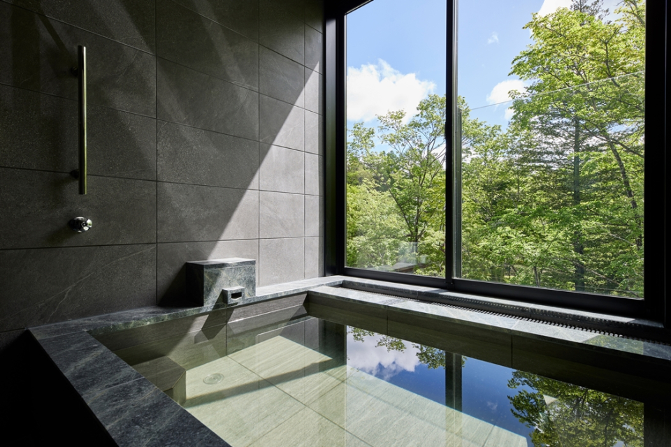 緑に囲まれた中庭と美しくモダンな造りの建物、エントランスを入ると目の前に広がるのはゆったりとしたラウンジなど、旧軽井沢の森にある静かな雲場池のほとりに誕生したSMALL LUXURY RESORTです。全室に備えられた床暖房とゆれる炎の暖炉がお部屋を暖かく包み込み、ウォールナットの落ち着いた雰囲気や、床に敷き込まれた絨毯がシックな大人の別荘空間を演出します。レストランでは新鮮な信州野菜をはじめ、信州牛や信州ポーク、季節の果物などをふんだんに使った月替わりのお料理を、中庭の季節の移り変わりをお愉しみいただけるカウンター席やゆったりとした個室のお席で提供しています。