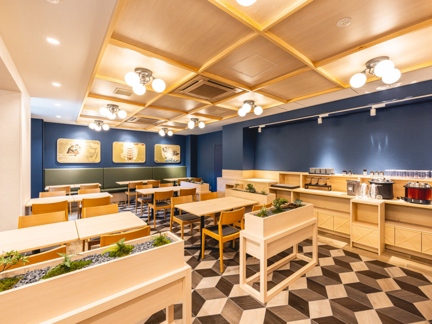 レストランでは、モーニングからディナーに至るまで、和洋折衷の豊富な料理をご提供。カジュアルさと洗練さを兼ね備えた店内は、ゆったりと開放的な空間が広がります。フロント・レストランには「徒然草」をイメージした内装をメインに、二条城の天井画など、京都らしい和柄を融合させた、非日常的な空間を演出。1階から上階に進むにつれて「平安時代」から「鎌倉時代」へと時代が現代へと近づくイメージで階ごとにテーマを変えており、他にない、ひと味違った雰囲気を体験していただきたいと思っております。