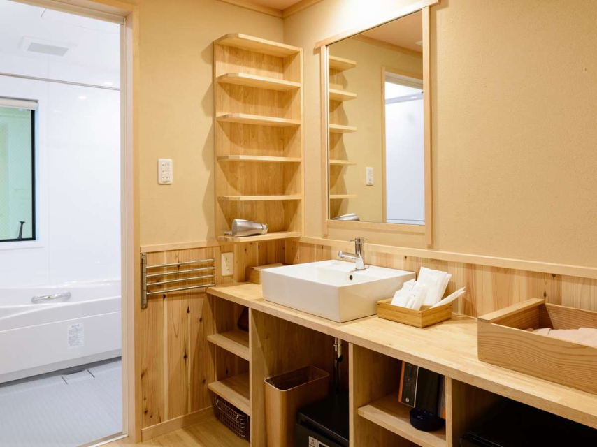通りに面した格子窓、腰掛けるときだけ下ろす軒先の「ばったり床几」、敷地と道路を隔てるとともに、泥はねや埃から家を守る「犬矢来」、ひさしの上で災いから家を守ってくれる「鍾馗(しょうき)さん」など、京町家の伝統的な意匠や日本の木造建築のよさを受け継ぎつつも、新築ならではの現代的な設備を備えています。