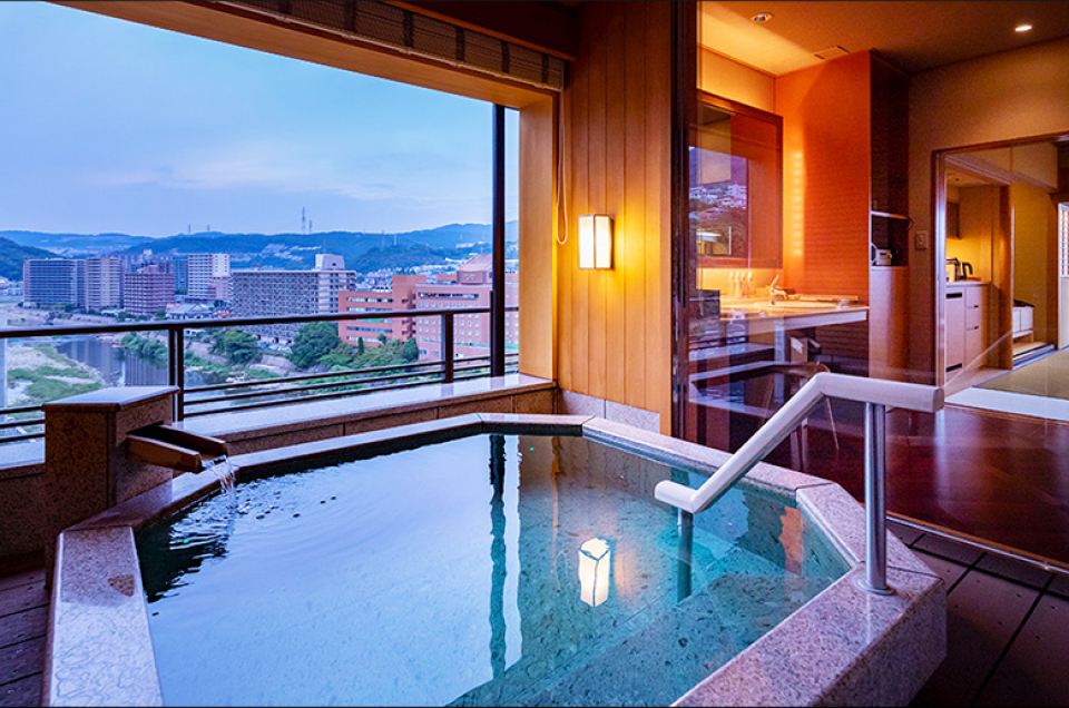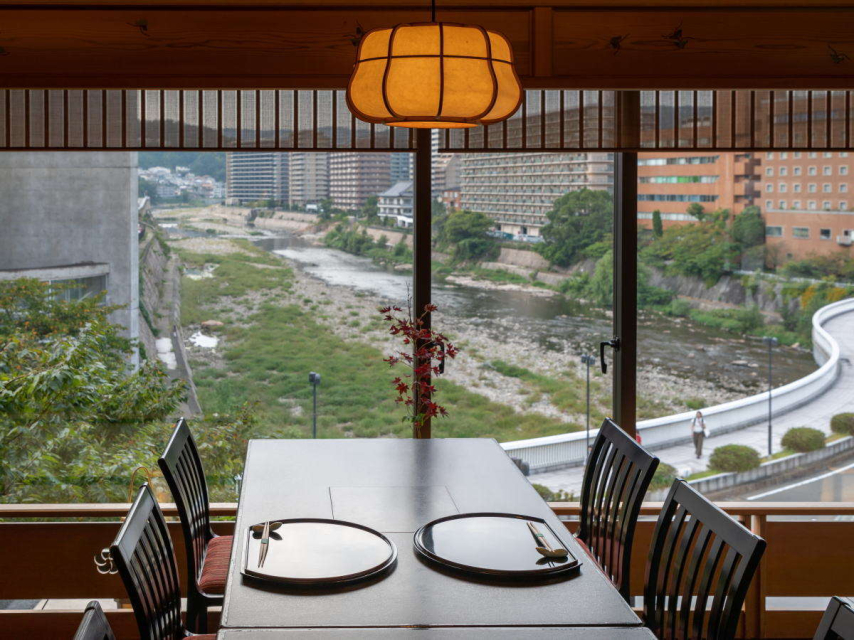 ホテル若水は、悠々と水が流れる武庫川のほとりに建つ温泉旅館です。