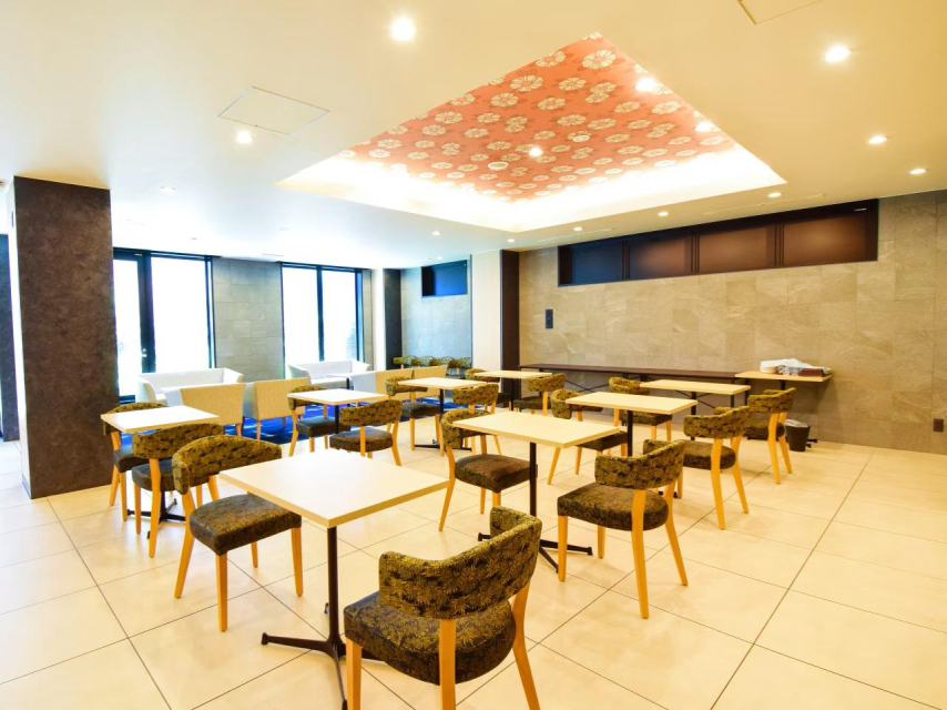1階には会議や懇親会、朝食会場としても利用できるラウンジを備えます。