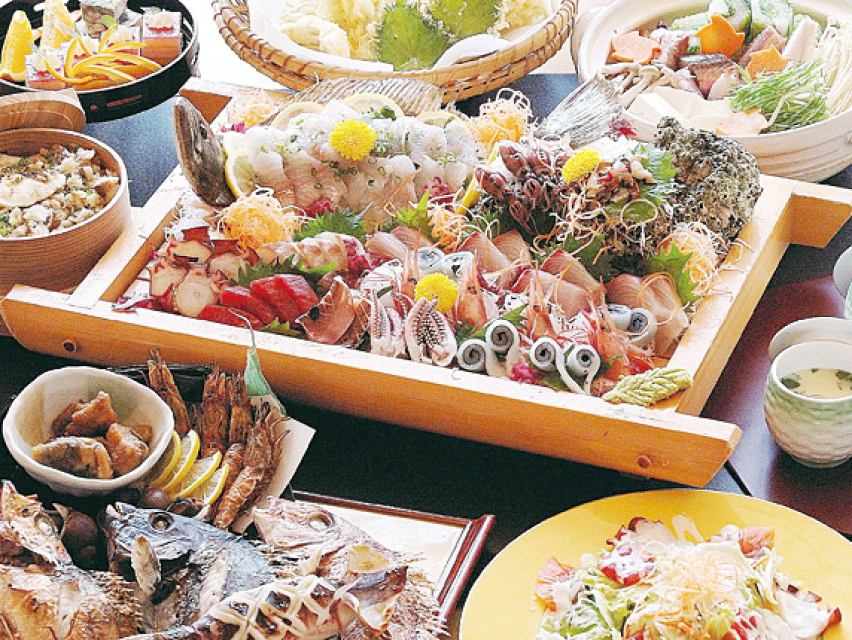 近隣漁港直送の数々の鮮魚の中から、その日の刺身と焼き魚を自分で目利きして選ぶ「市場で選べる鮮魚会席プラン」が人気です。