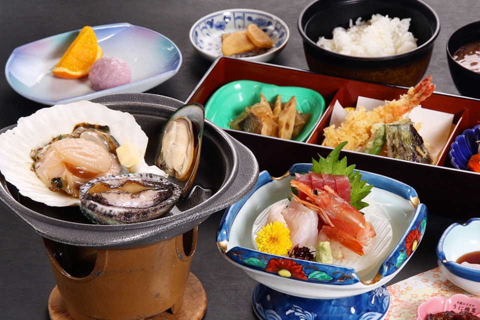イチ押しの「あわび・帆立」の陶板焼きは、磯の香り漂う贅沢な逸品。