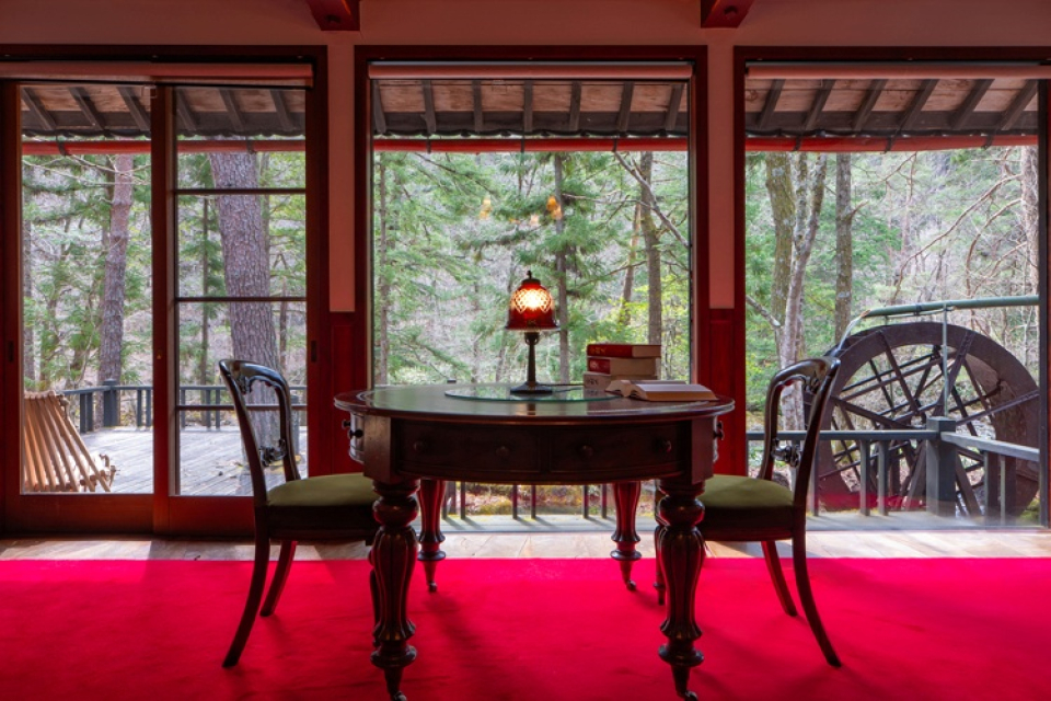 一枚のガラスの窓からは飛騨の大自然がまるで一幅の絵画のように、庭園内を流れる清流・宮川のせせらぎが心地よい音楽のように心を和ませます。