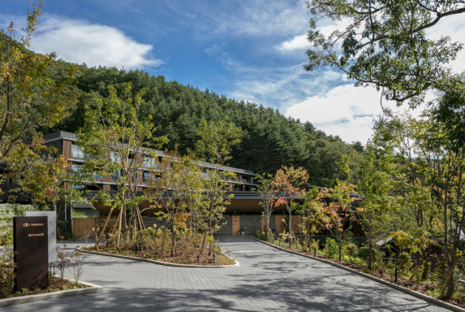 環境に優しいバイオエタノール暖炉、富士山溶岩を敷いたオープンエアーの客室温泉露天風呂、この地で育った木々やこの地に眠っていた石をカウンターの天板や客室の家具に生かしたインテリア等、この地の魅力を味わっていただける唯一無二のリゾートとして誕生しました。