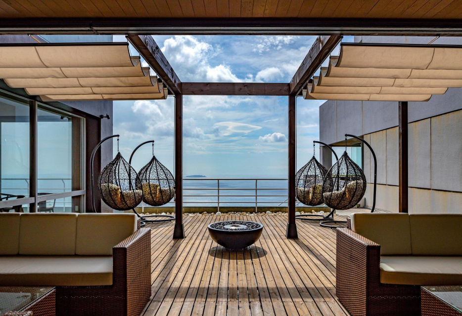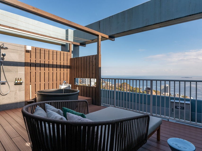 24階~28階の4フロアからなるISHINOYA熱海は高台に位置し、屋上テラスからは地平線と海を一望。